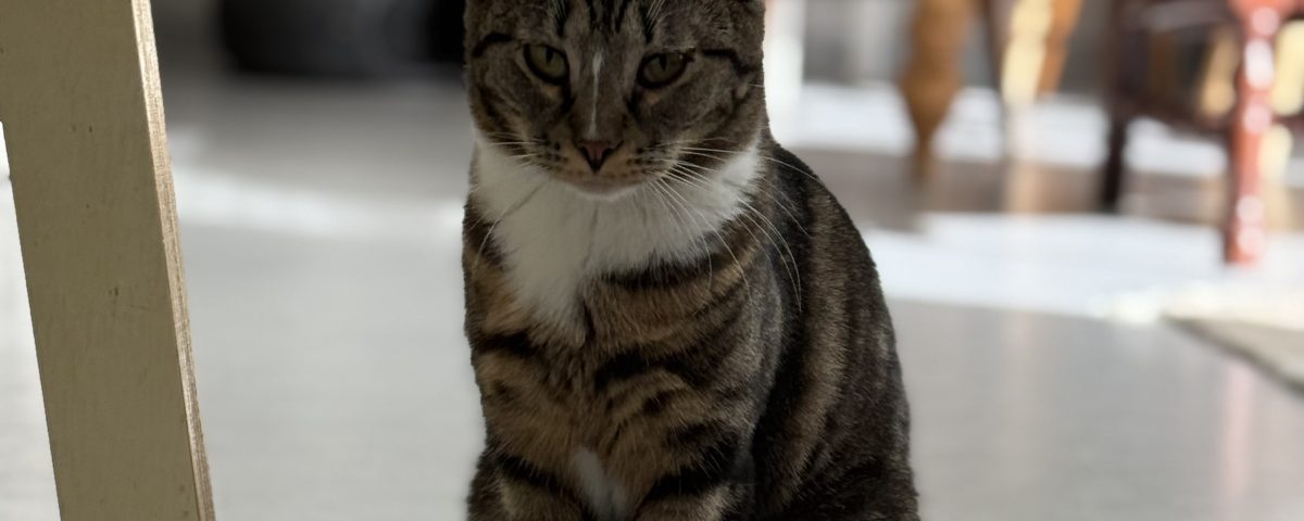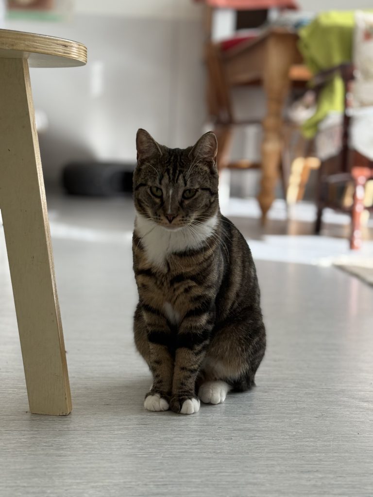 Jännä-mamma är en katt med populationsbakgrund som kom till huset tillsammans med sina kattungar i början av våren 2025. Jännäs beräknade födelseår är 2024, så det är en ung fröken vi har att göra med!